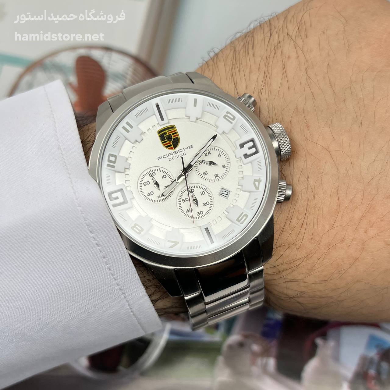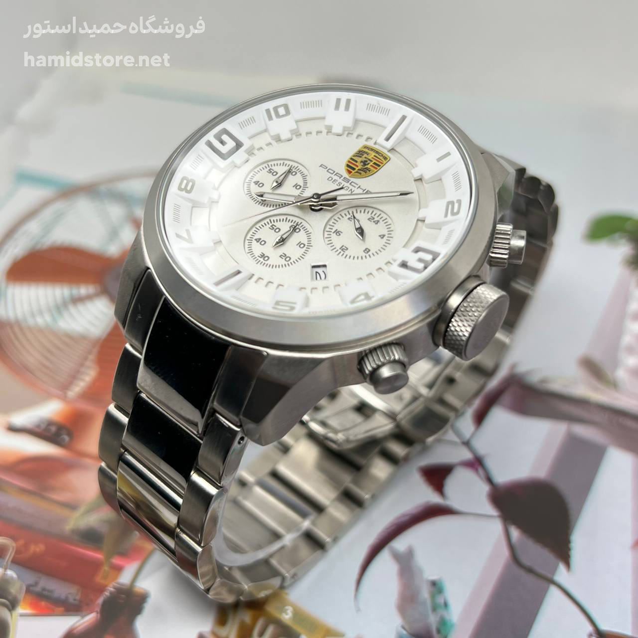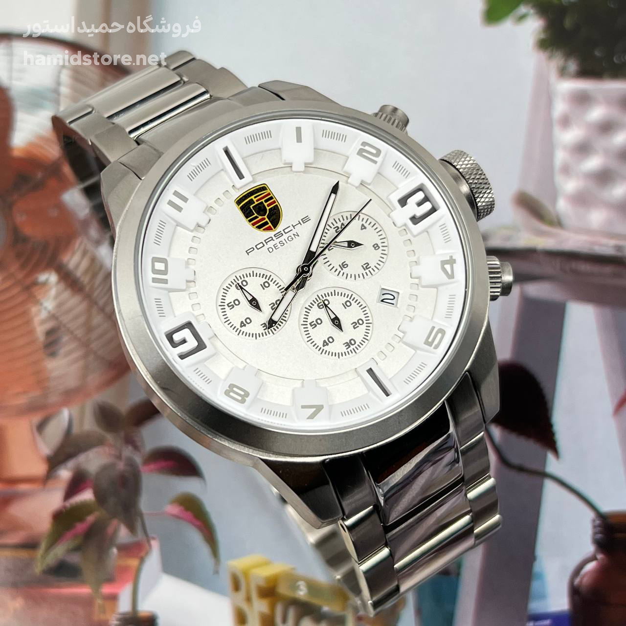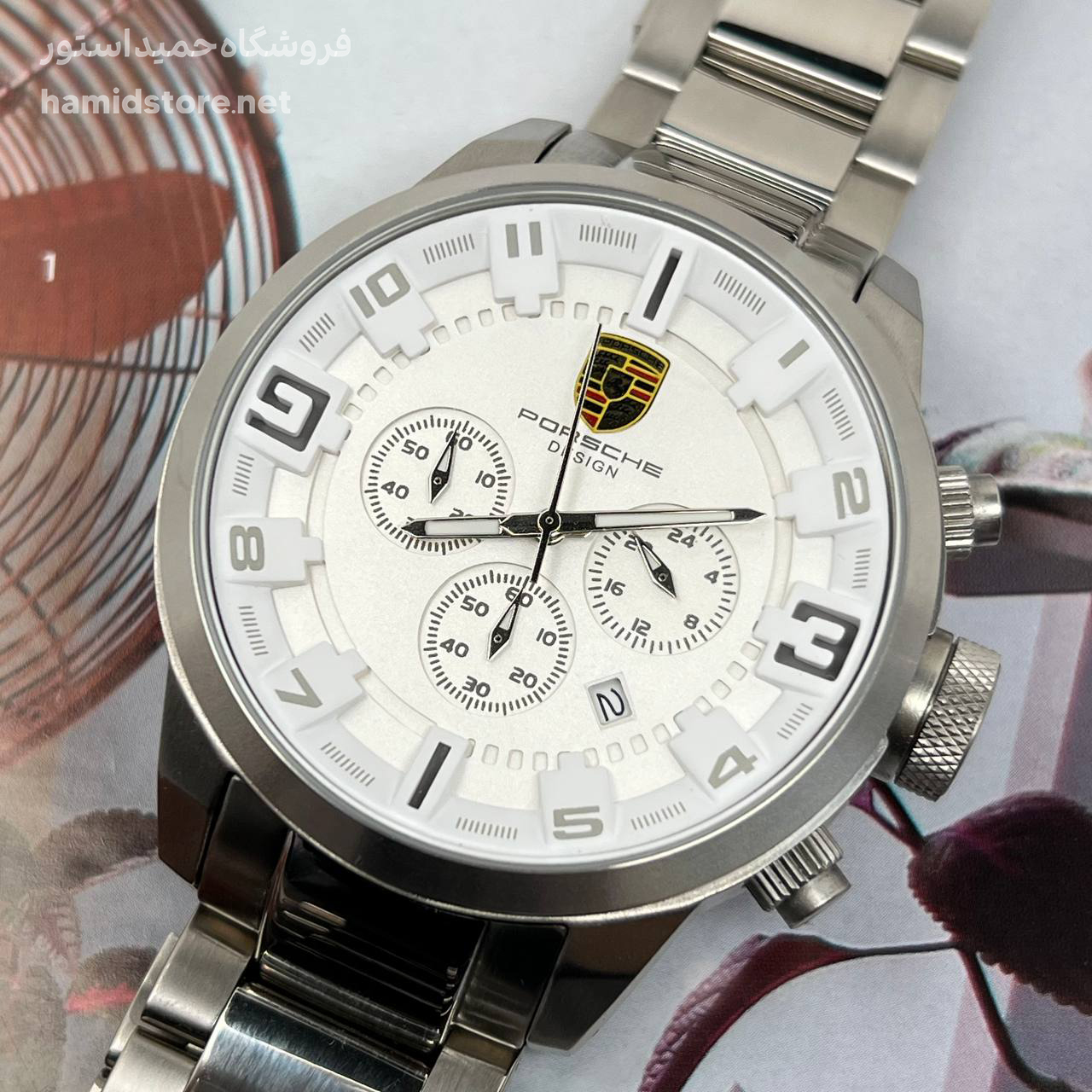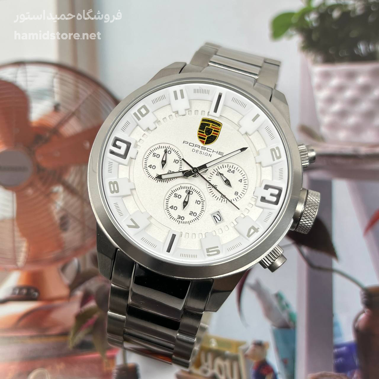 ساعت مردانه پورش دیزاین سه موتوره کرنوگراف صفحه سفید بدنه سیلور Porsche Design