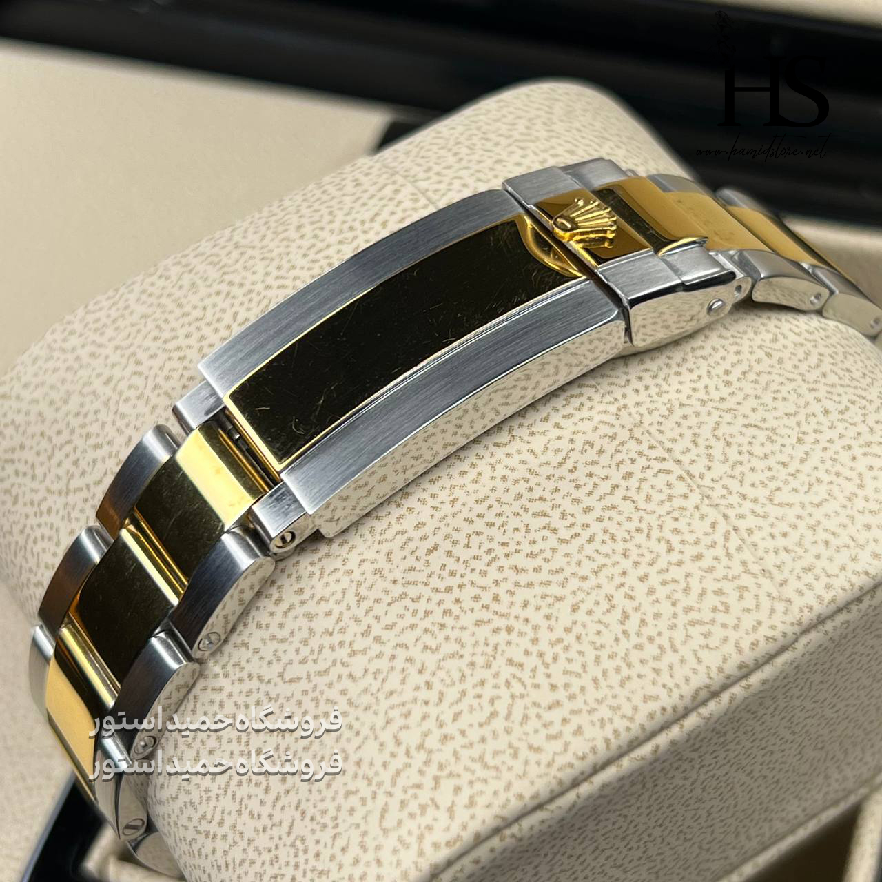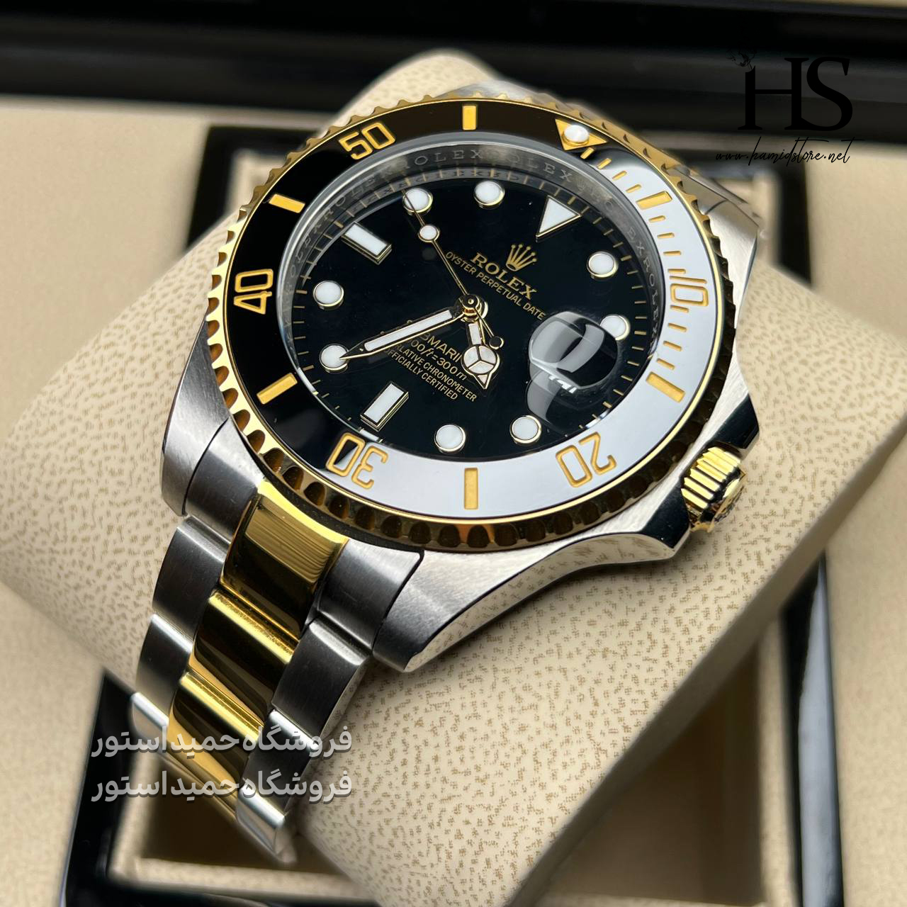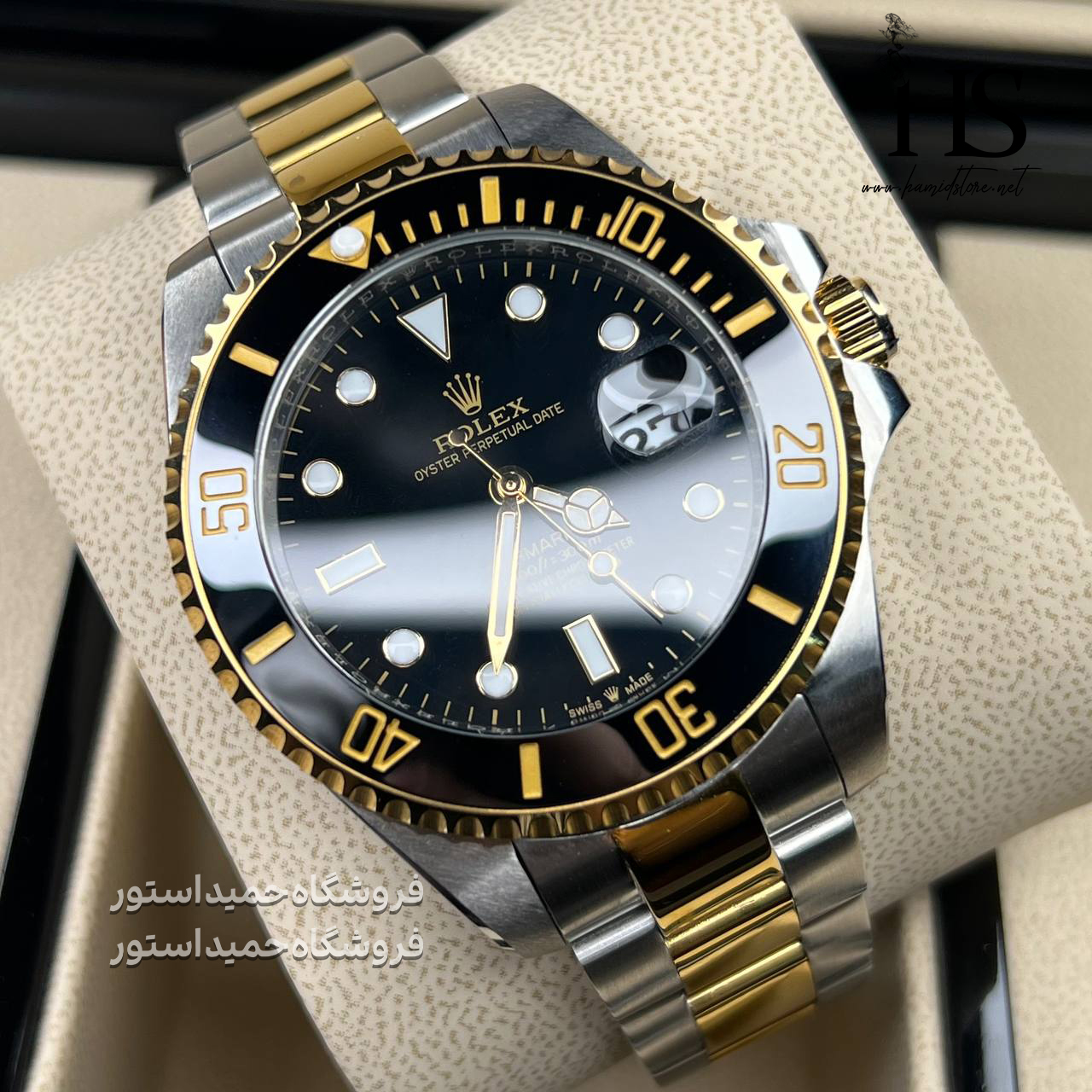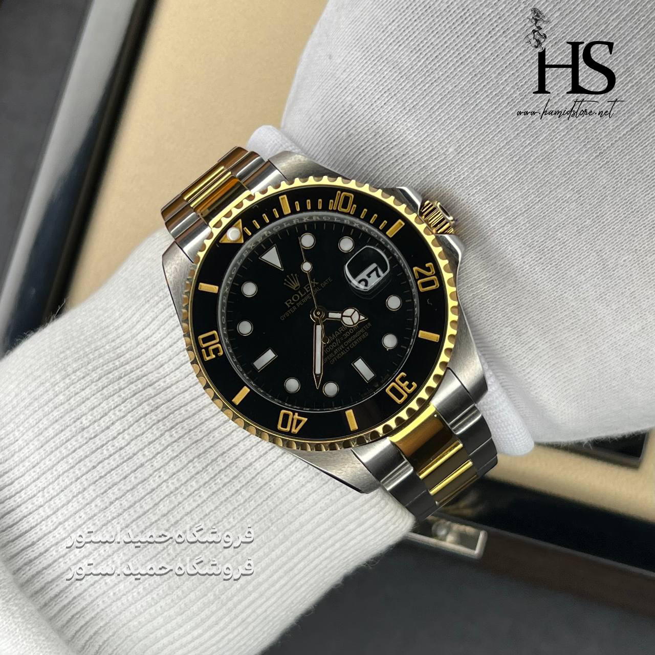 ساعت رولکس مردانه سابمارینر موتور باطری صفحه مشکی بند نقره ای طلایی Rolex Submariner