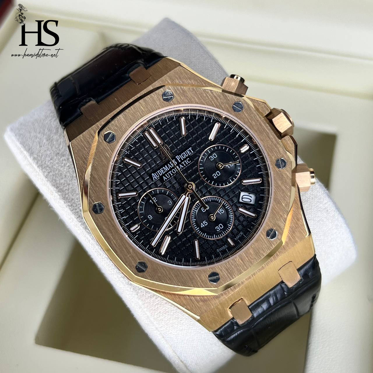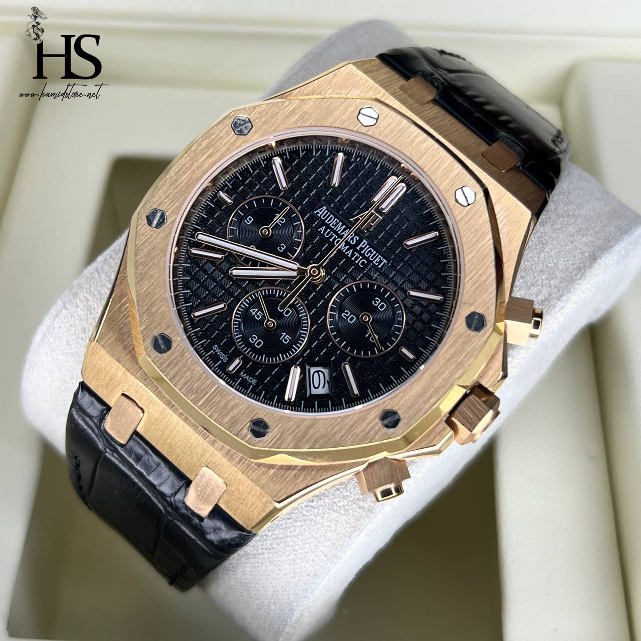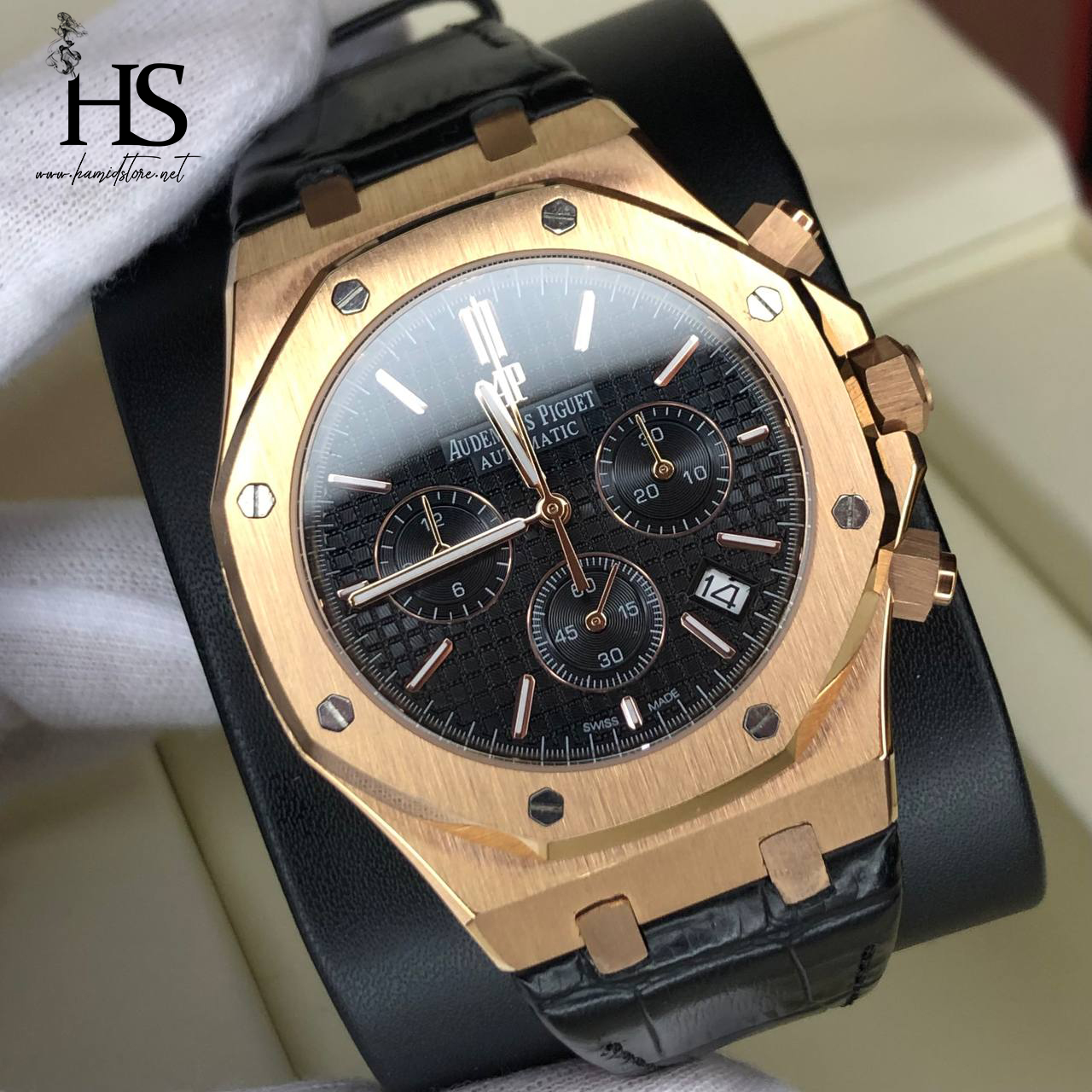 ساعت مردانه AP Chrono leather Rosegold Black کورنو رزگلد صفحه مشکی بند چرمی