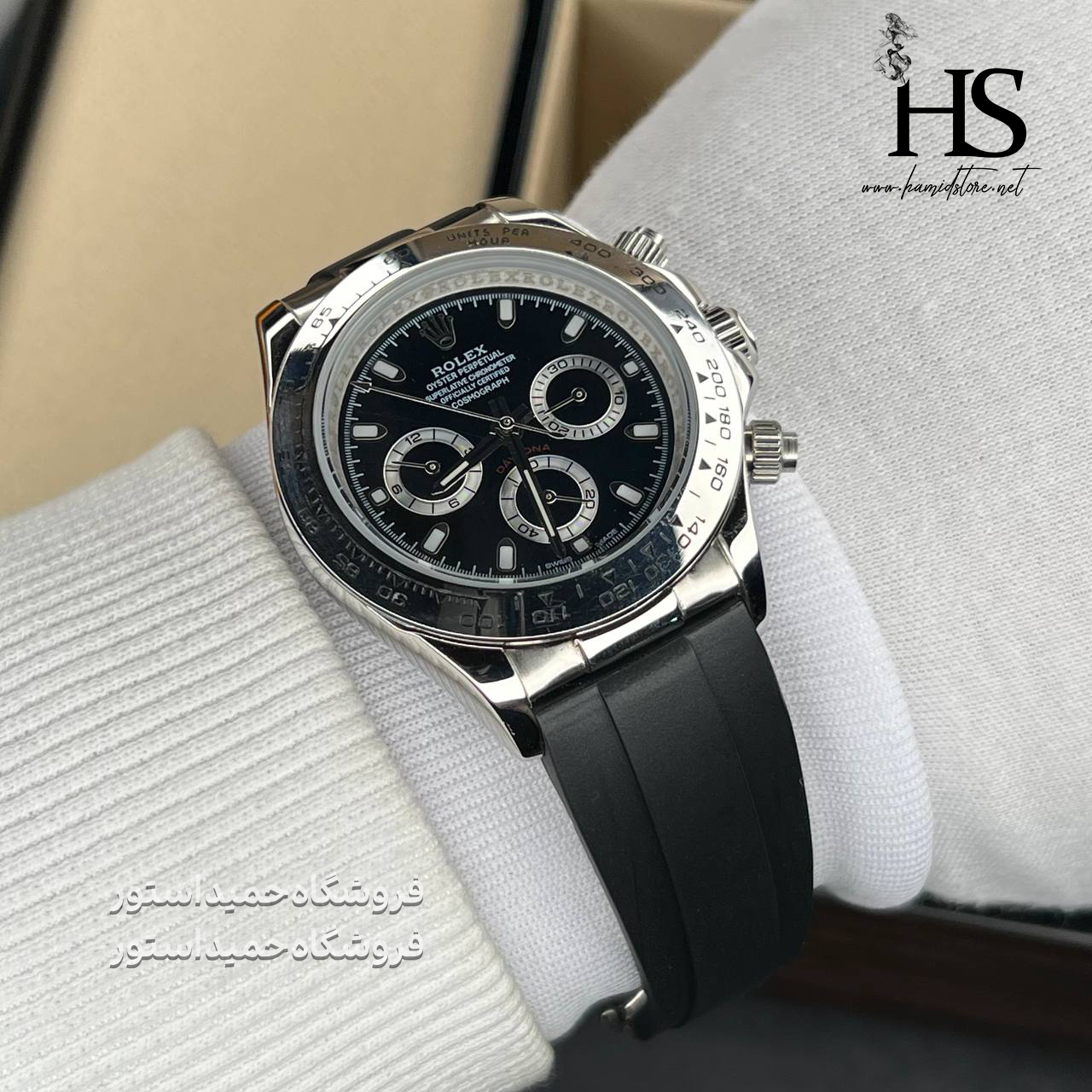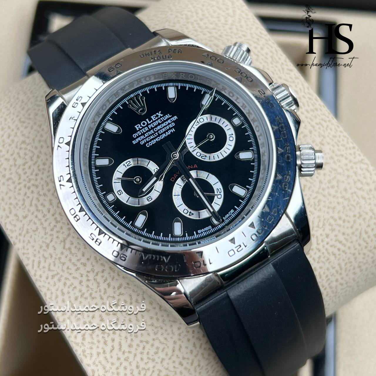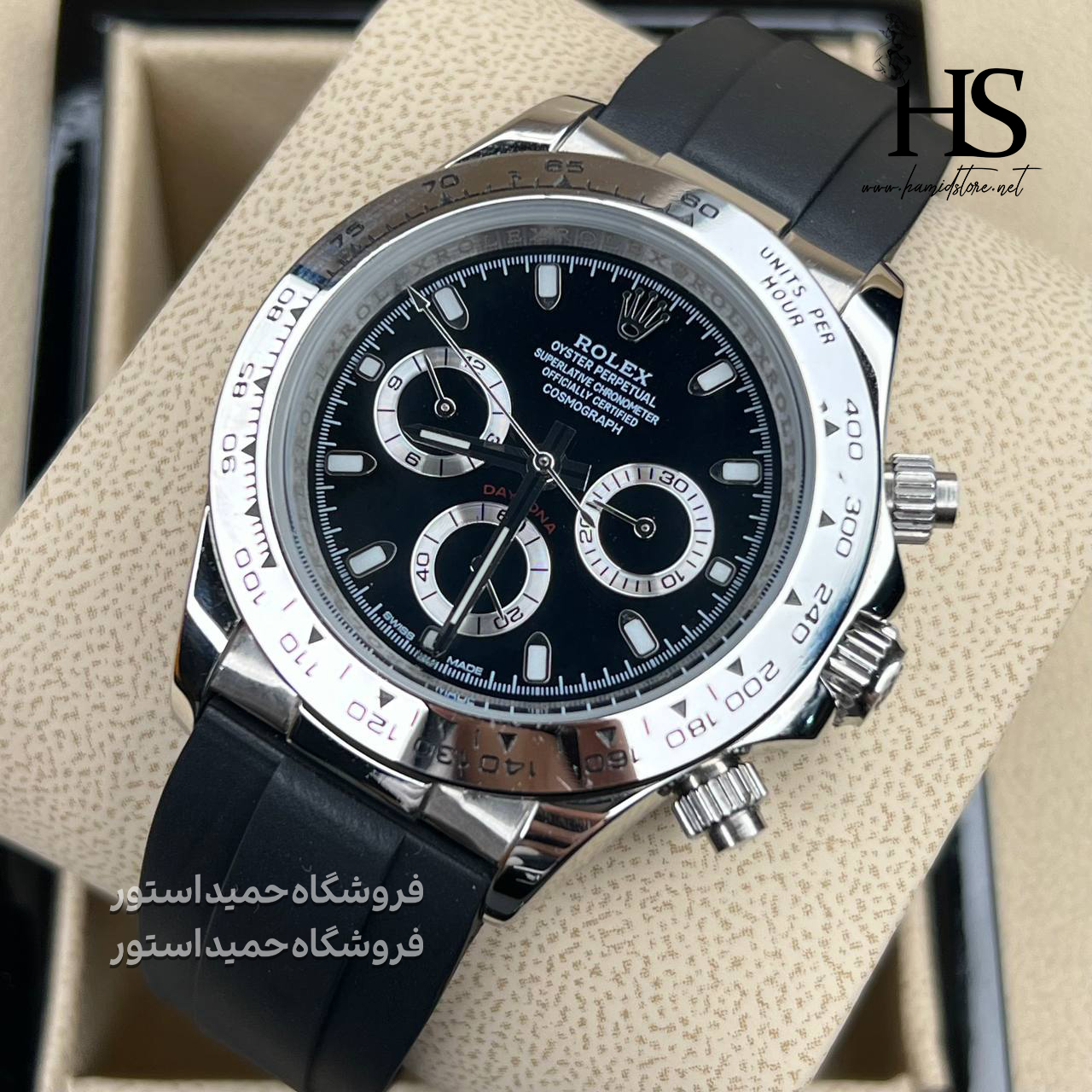 ساعت مردانه رولکس دیتونا اتوماتیک و باطری بند رابر Rolex Daytona Cosmograph Silver Black Screen